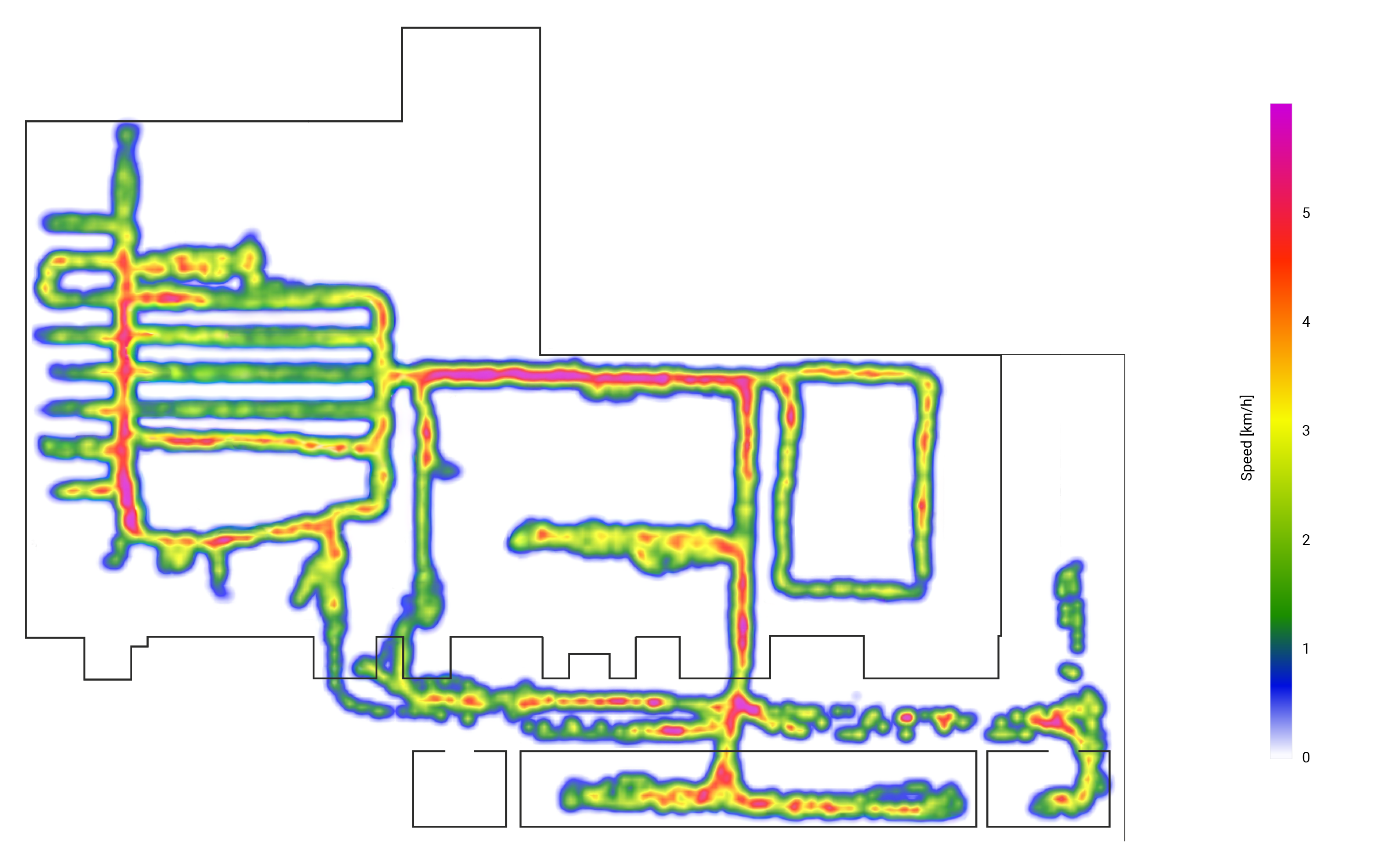 - Velocity heatmap: Similar to the position heatmap, the visualization overlays colored areas onto the plant blueprint. The colors indicate the areas traversed by the recorded forklifts, and the color intensity represents the average speed at which these surfaces were traversed during the recording period.